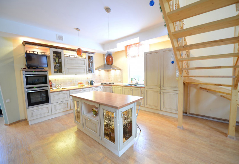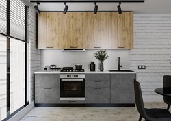 Прямая конструкция, полный комплект из навесных и напольных шкафов.