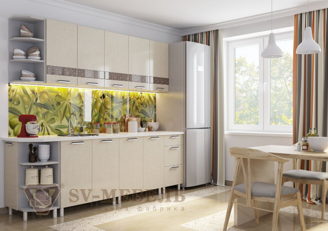 Новинка фабрики. Отличительная особенность гарнитура - это отсутствие стеклостворок: все фасады глухие. Линейная кухня сочетает в себе отличную функциональность и приятный дизайн. Фасады из ламинированной ДСП Egger окрашены в светый кремовый цвет «Лен» и декорированы линией с узорчатой фактурой - декоративным стеклом с орнаментом на верхних шкафах. Большое количество выдвижных и распашных ящиков позволит разместить всю кухонную утварь.