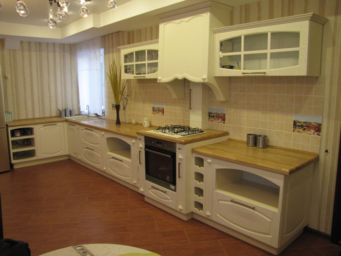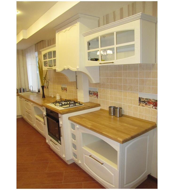 Кухня исполнена в стиле кантри, одинаково хорошо подойдет как для дачного, так и для современного городского интерьера. Гарнитур выполнен из массива дуба, отличается долговечностью и экологичностью.