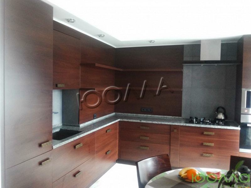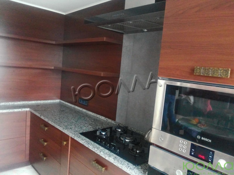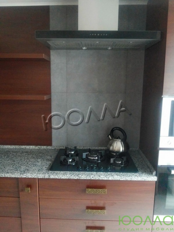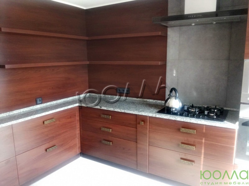 Угловая кухня в тропическом колониальном стиле с элементами минимализма. Одноцветный фасад древесной фактуры красно-коричневого оттенка естественно гармонирует со столешницей из светлого камня. Кухня изготовлена со скрытыми креплениями и фурнитурой по немецкой технологии "Фолдинг".