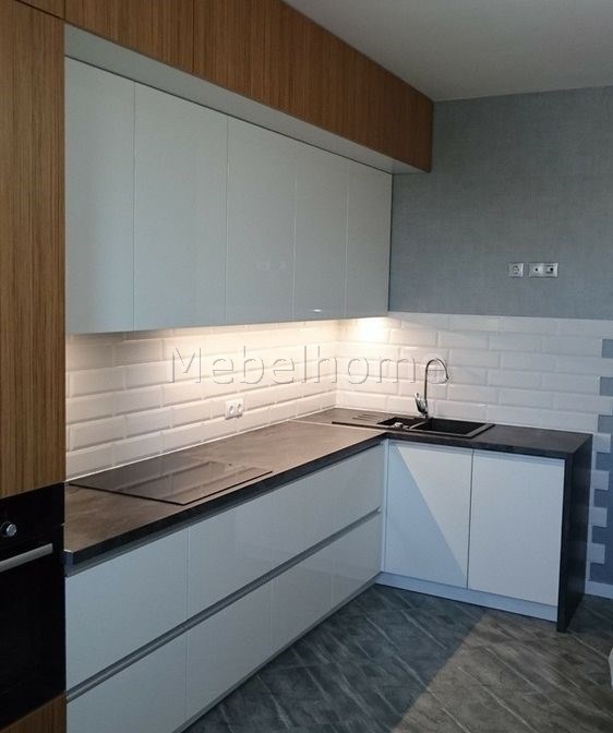 код 107396Фартук под кирпичную кладку, ниши для техники, подсветка рабочей зоны, черная столешница, интегрированные ручки.