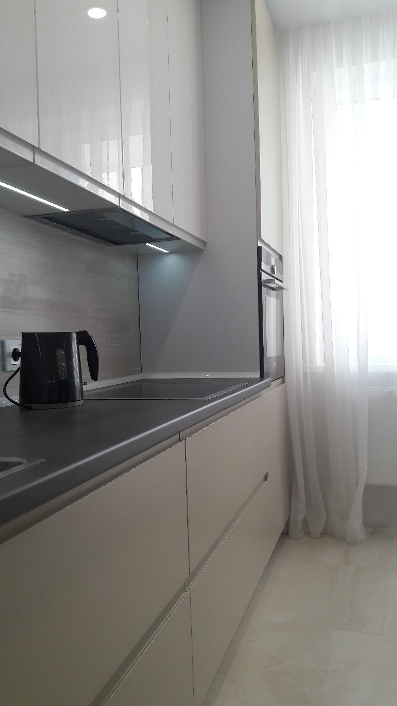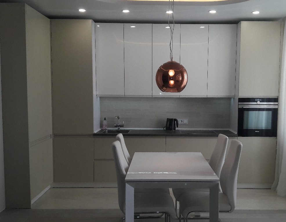 Линейная кухня с белыми фасадами без ручек