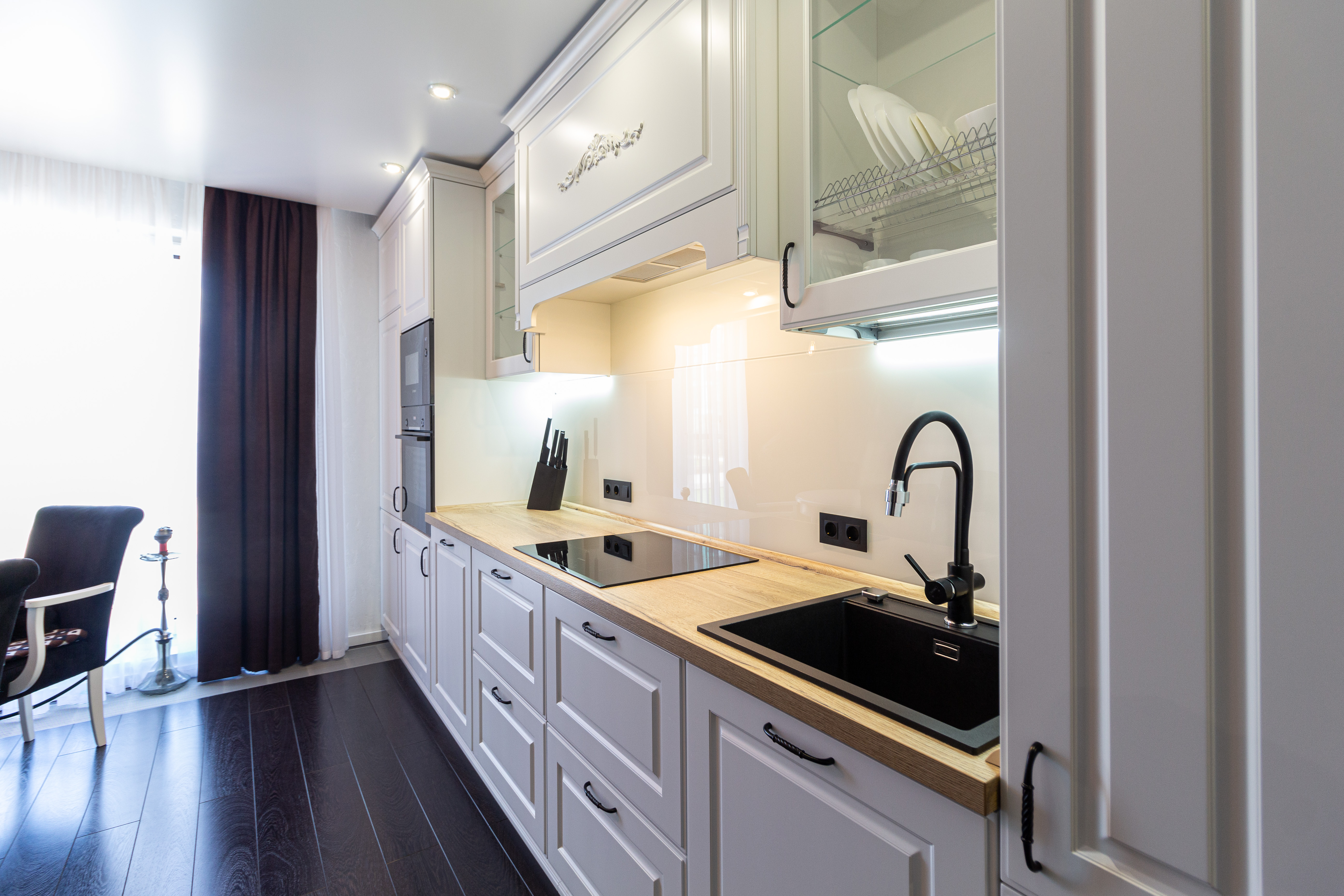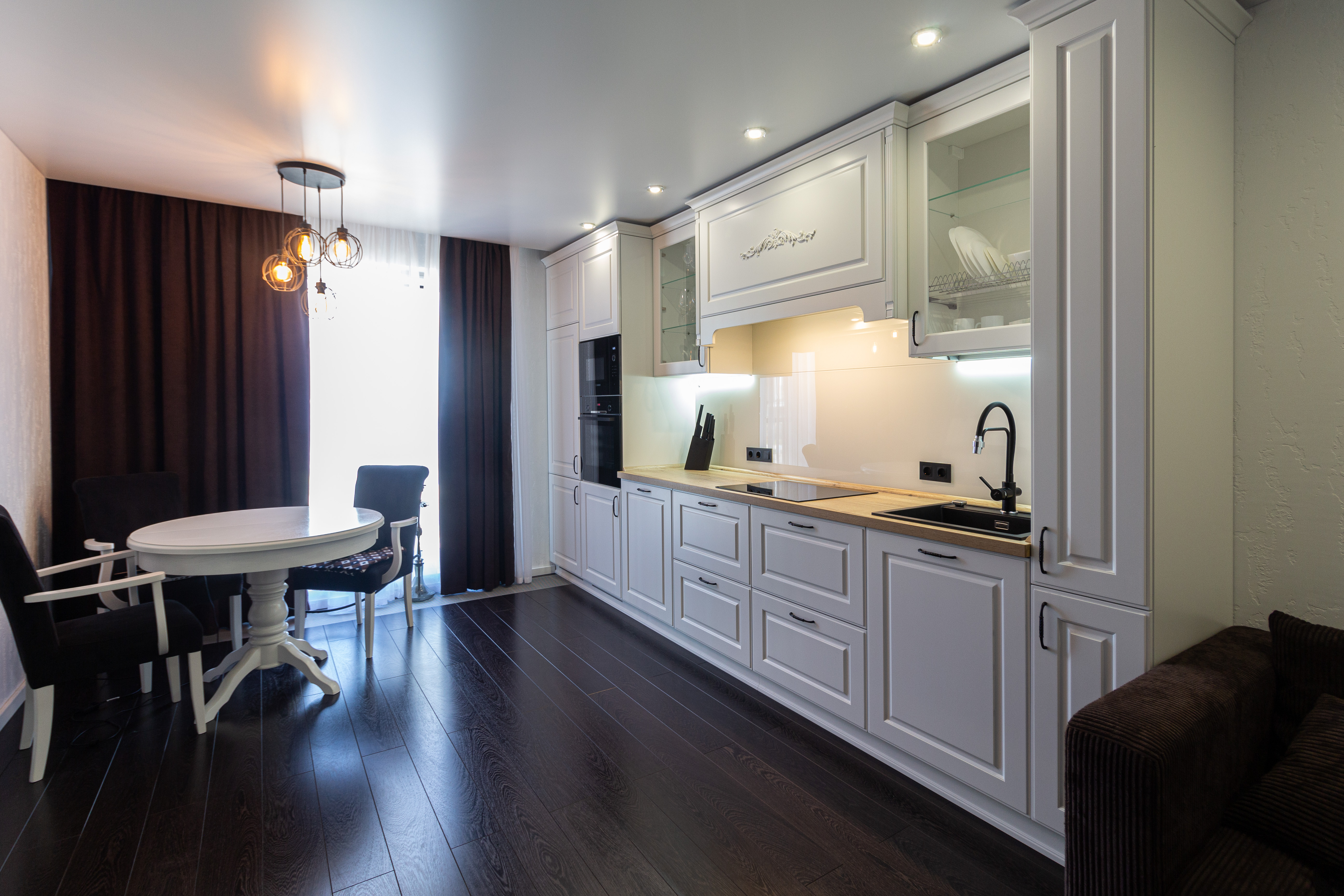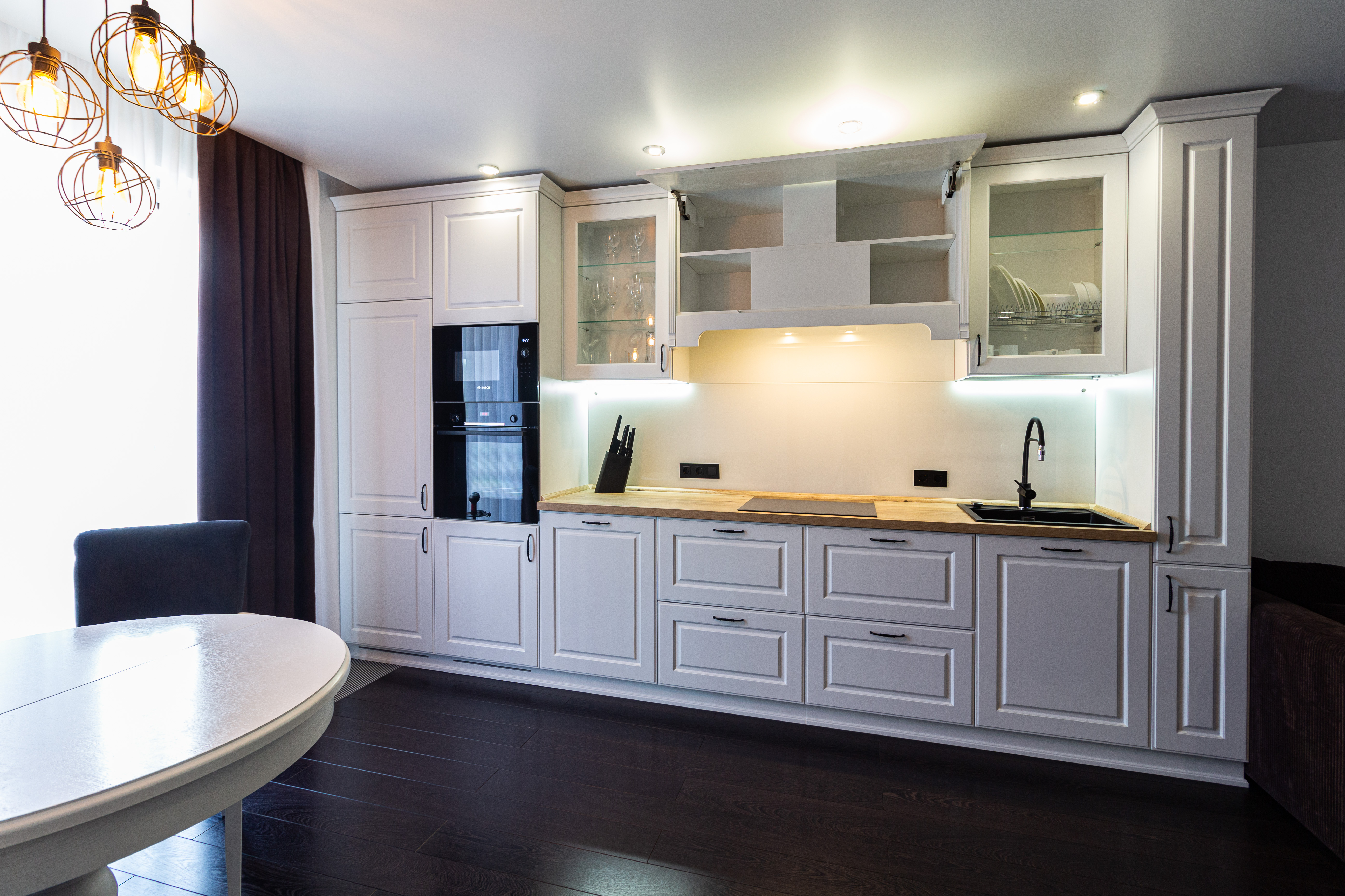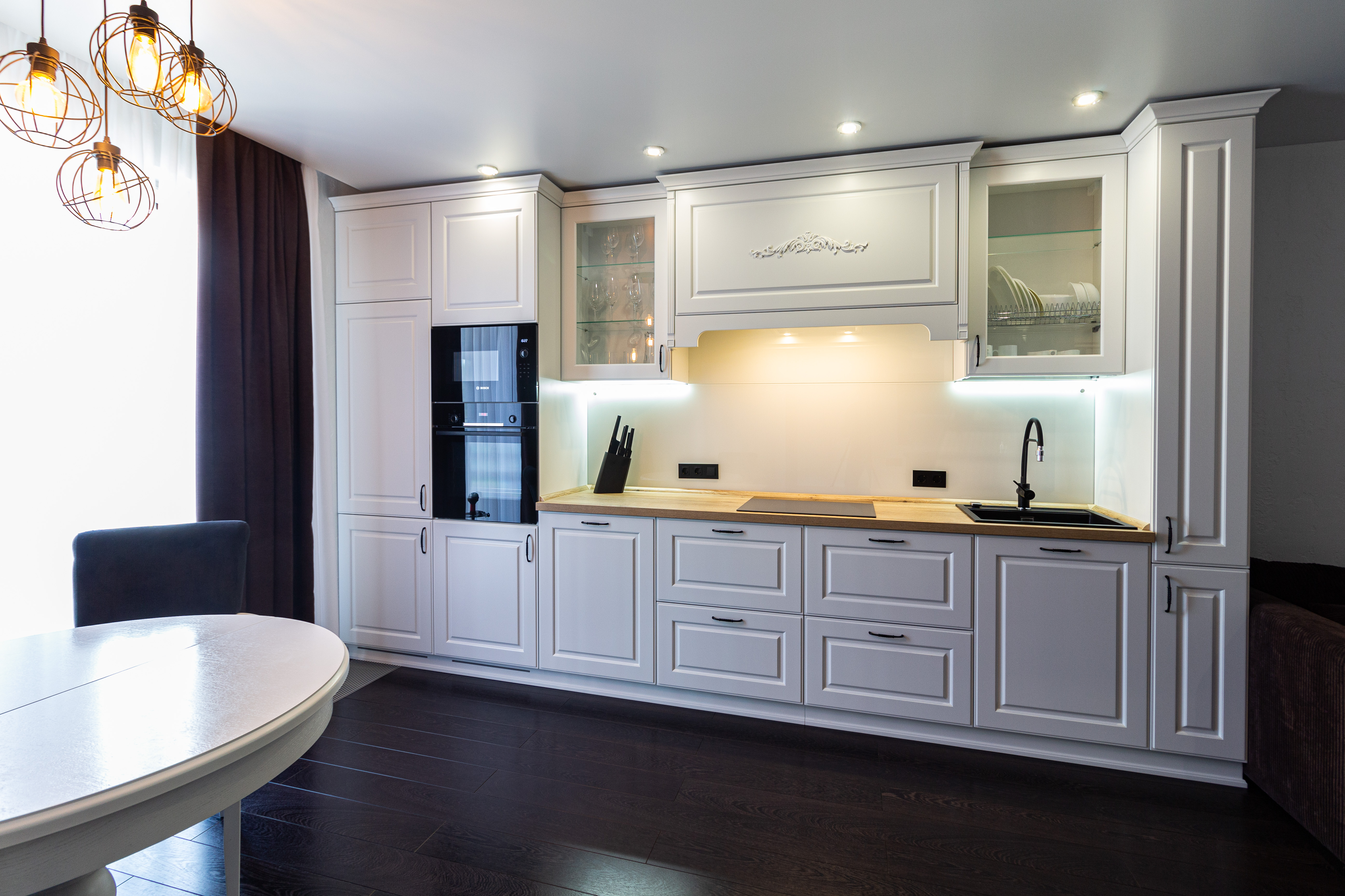 Линейная кухня с белыми фасадами