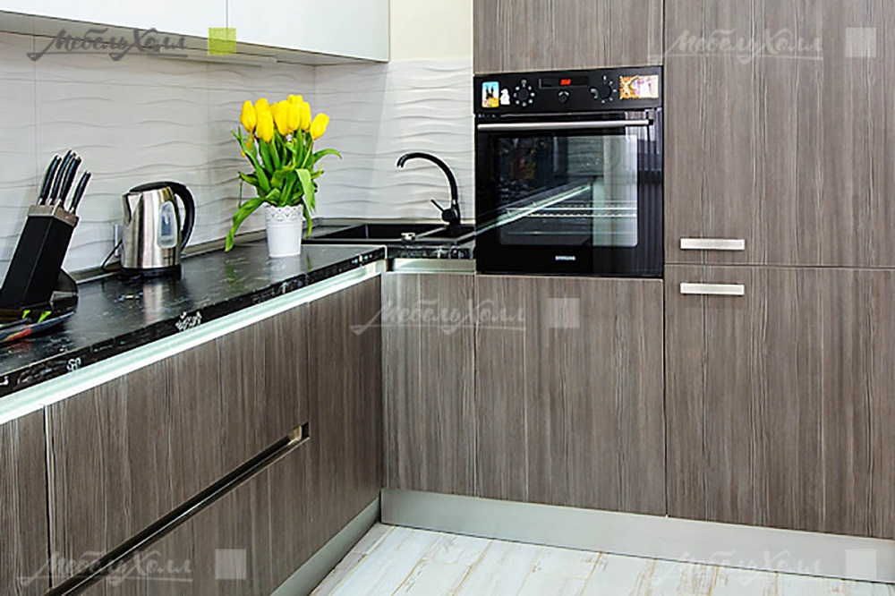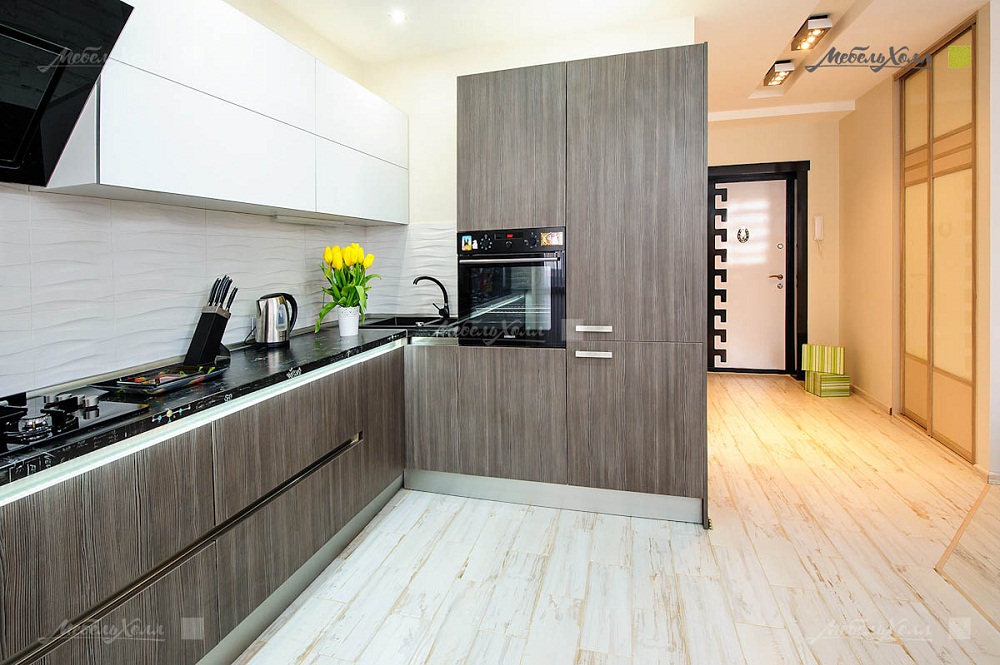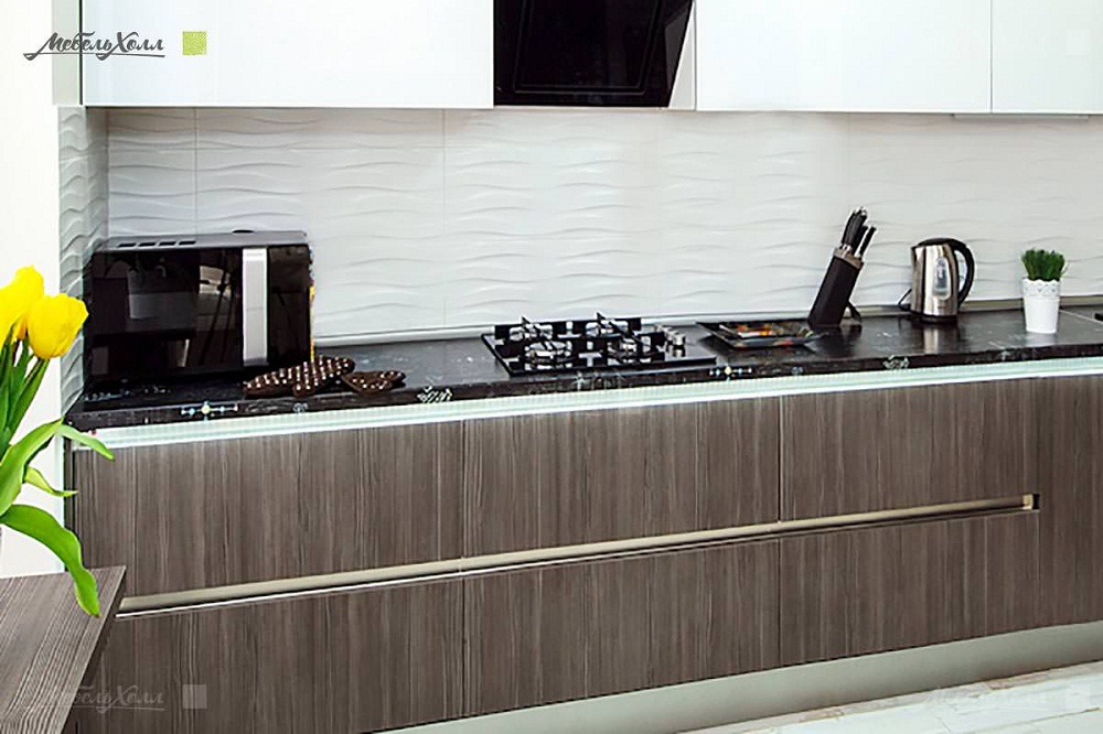 Кухня серо-коричневого цвета с белыми глянцевыми верхними фасадами. Нижние фасады выполнены из ДСП Egger с отделкой под дерево. Изюминкой кухни является интегрированная ручка Volpato, которая позволяет не разбивать фасад кухни на множество ящиков, а создать единую конструкцию. При этом вместительность и количество мест хранения не страдает. Верхние фасады – белый глянцевый акрил Niemann. Они оснащены австрийской фурнитурой Blum (система Aventos), которая упрощает доступ к верхним полкам. Обратите внимание на столешницу из постформинга Getalit: ее необычный и озорной узор несколько разбавляет строгий стиль всей кухни.