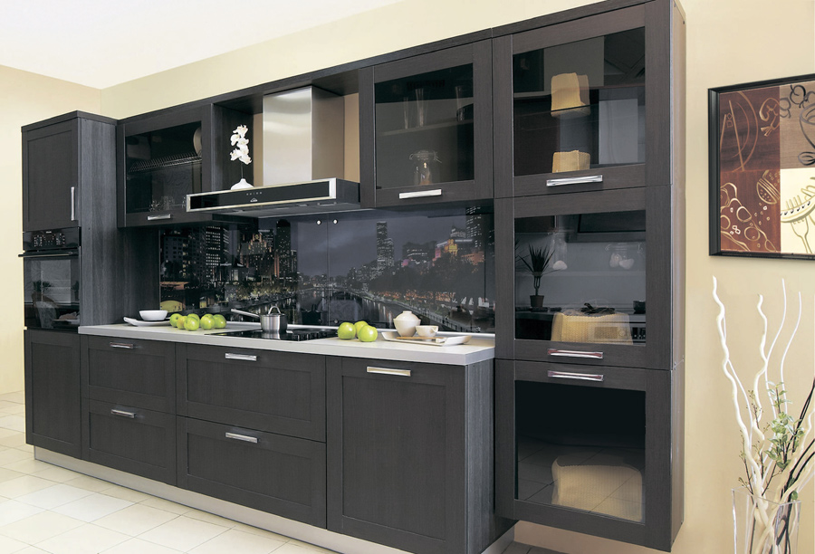 Кухня характеризуется привлекательным дизайном. Рамочные фасады из МДФ окрашены в черный цвет, часть из них имеют вставки из тонированного стекла. Эффектный дизайн подчеркивают стеклянные скинали с фотопечатью.