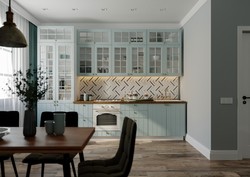 Витражные вставки в навесных шкафах. Открытые радиусные полки.