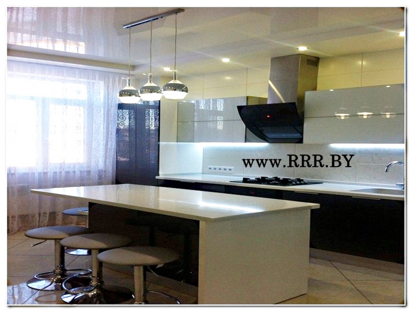 Глянцевые фасады без ручек, вместительные шкафчики, обеденная стойка.