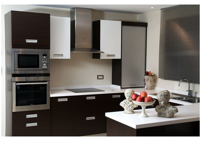 Кухонный гарнитур привлекает своими строгими формами и лакончиным дизайном. Большая часть модулей выкрашена в черный, два подвесных шкафчика и столешница выполнены в белом цвете. Для большего удобства при эксплуатации в модели предусмотрены врезные металлические ручки.