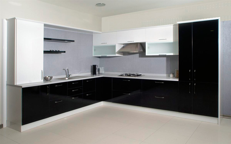 Черно-белая угловая кухня подойдет для обустройства просторного помещения. Корпус и фасады верхних шкафов окрашены в белый цвет. Нижние шкафы с глянцевой фактурой поверхности выполнены в черном цвете.