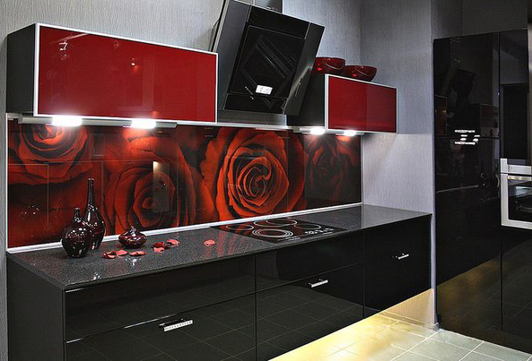 Кухня черно-бордовая скинали с розами
