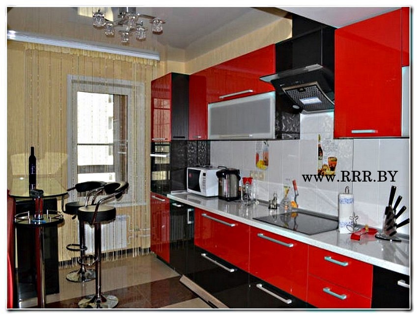 Современная линейная кухня выполнена из окрашенного высококачественного и прочного МДФ. Дизайн очень яркий и необычный, и подходит для экстравагантных и сильных людей. Фасад красно-черный и имеет глянцевую поверхность,однако такое необычное и слегка готичное сочетание не делает пространство тяжелее и меньше. Для некоторого разбавления активной пестроты столешница выполнена в белом цвете.