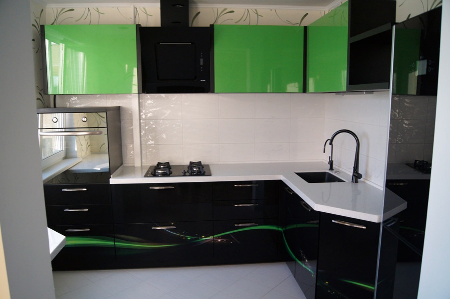 код 42014Цвет фасадов из крашеного МДФ: нижние – черный с зеленой аэрографией, верхние – зеленый.