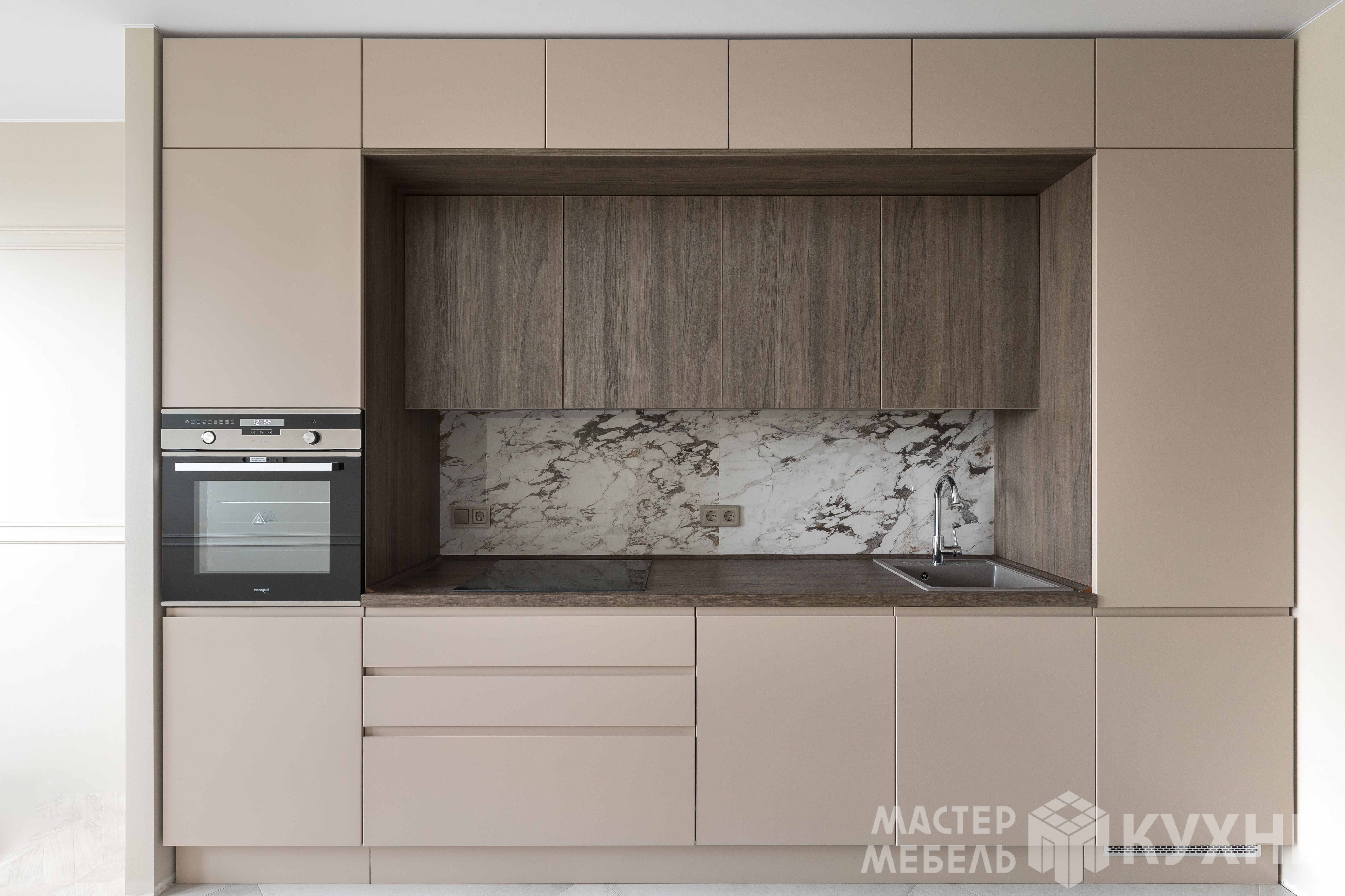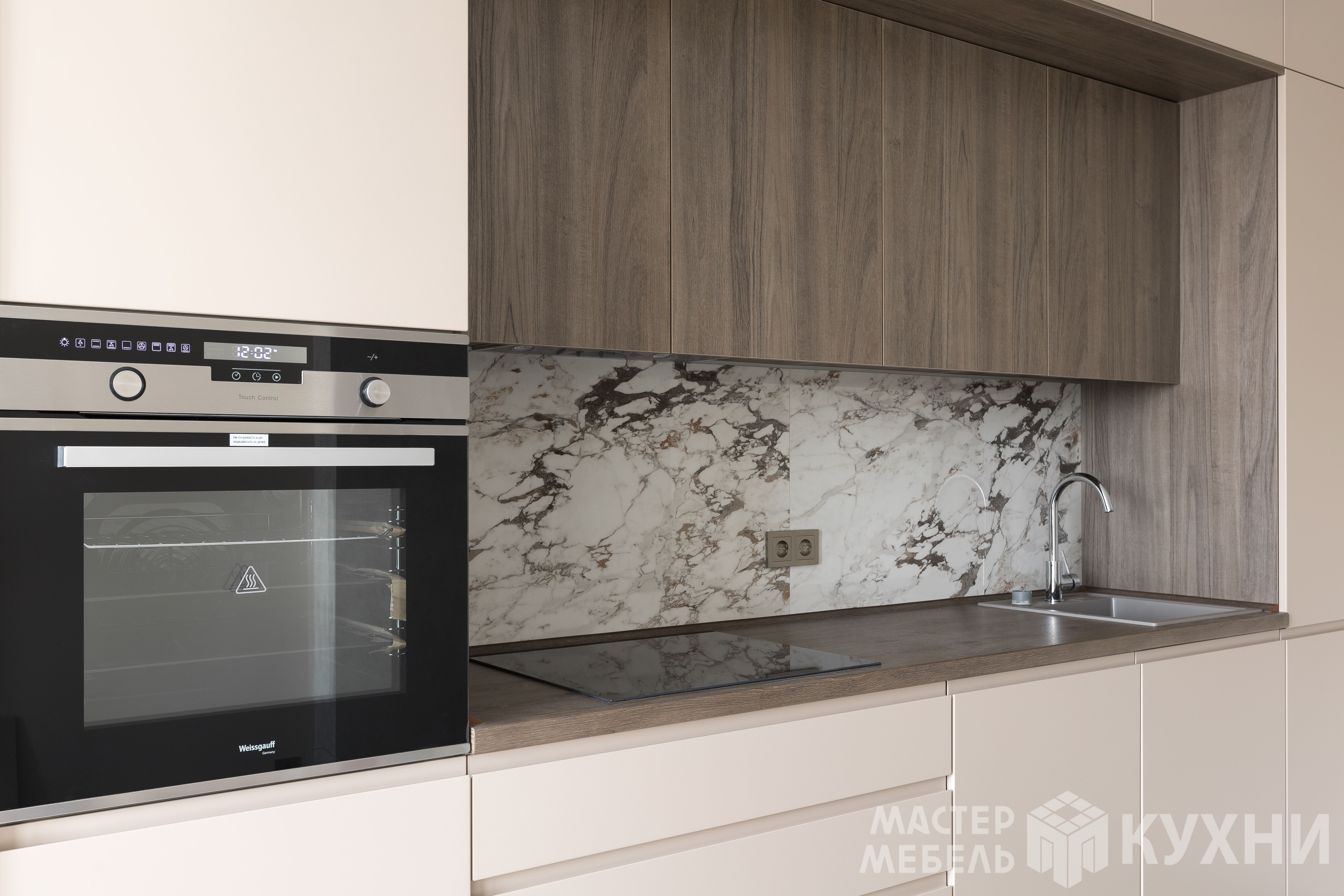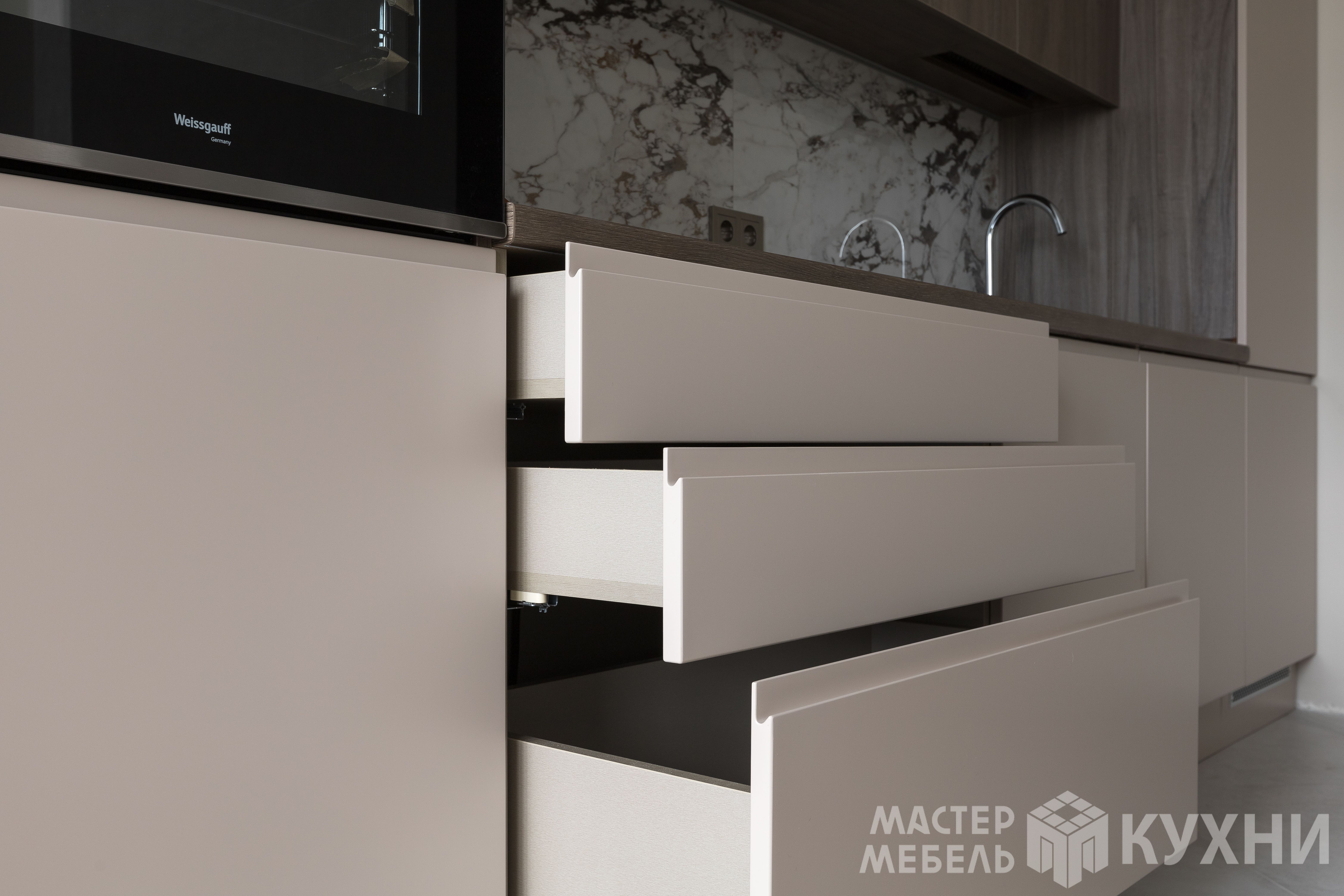 код 108960Встроенная бежевая кухня с матовыми фасадами без ручек