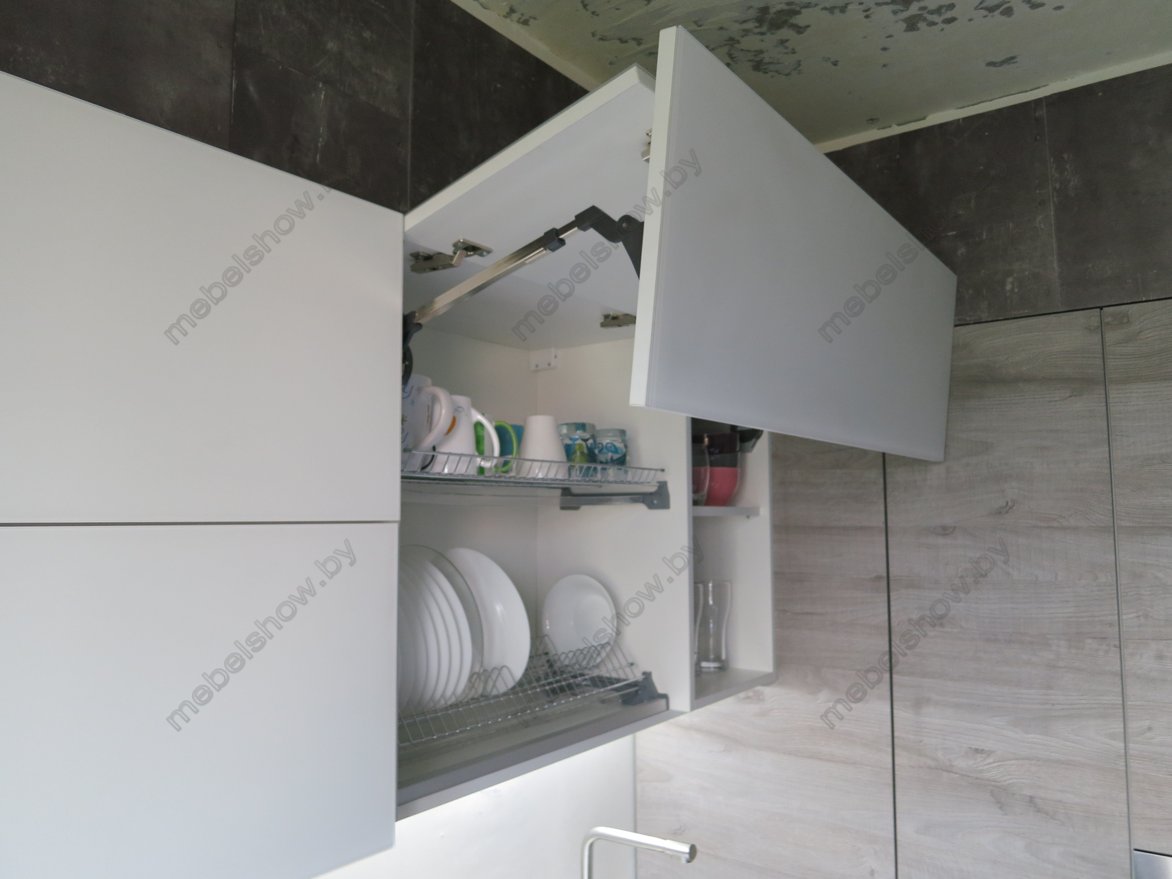 Верхние фасады: Matelak, матовое стекло, ДСП. Нижние фасады: ДСП CLEAF. Открытие ящиков: интегрированные ручки, специальные зазоры.