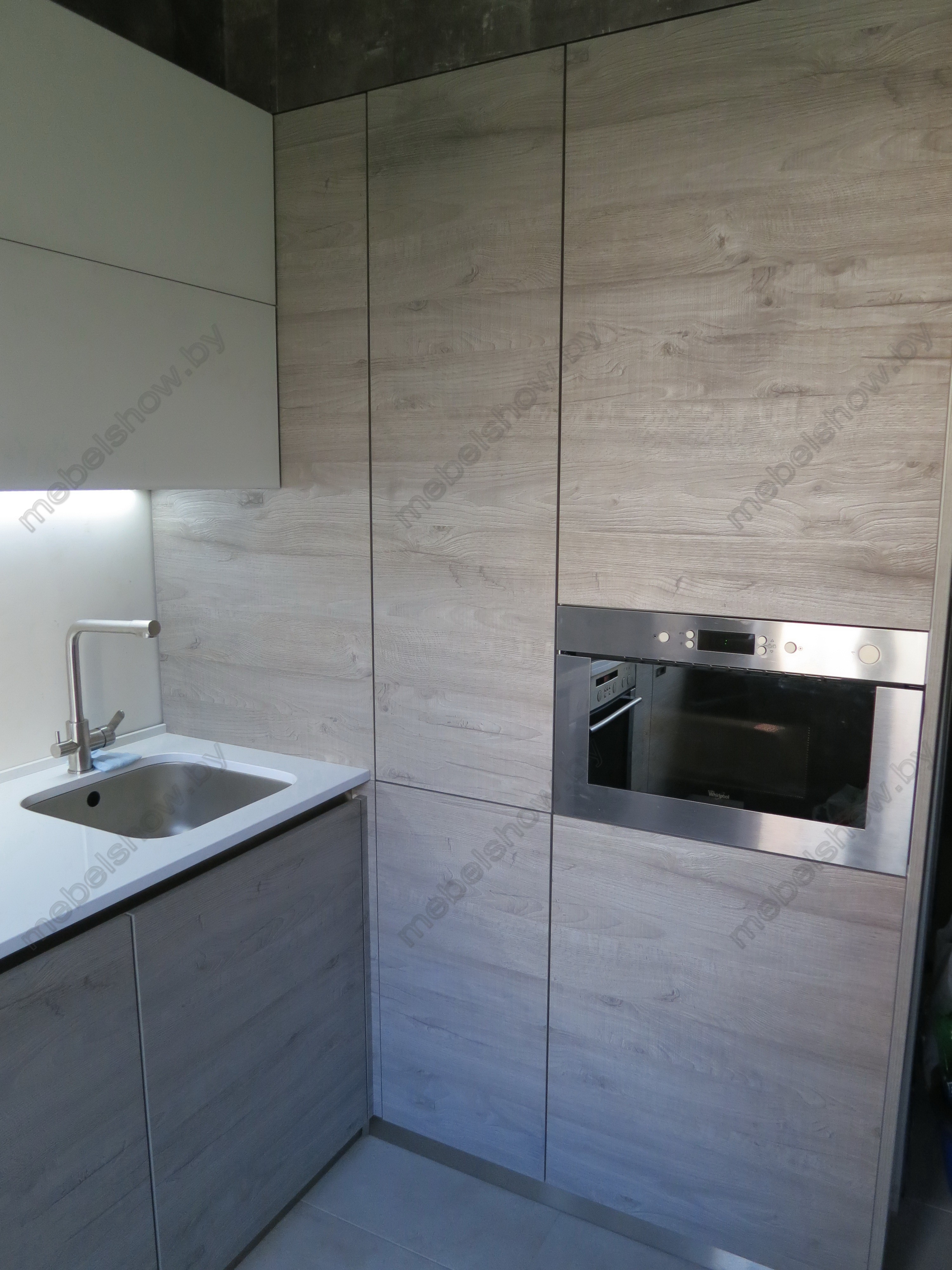 Удлиненные ручки из металла. Глухие фасады из матовой ЛДСП.