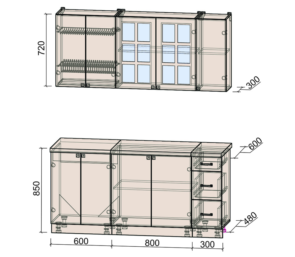 Материал фасада и корпуса: ЛДСП 16 мм. Ширина кухни 100 см.
