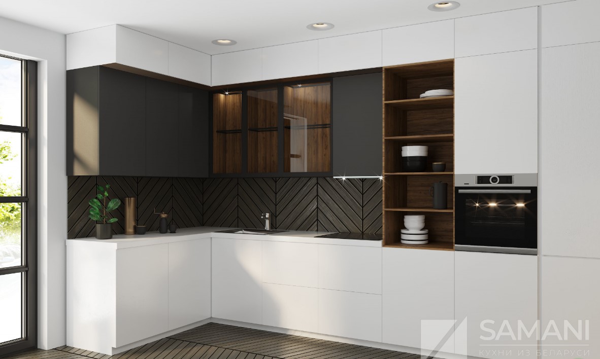 Угловая кухня 150х240 см с темными и светлыми фасадами.