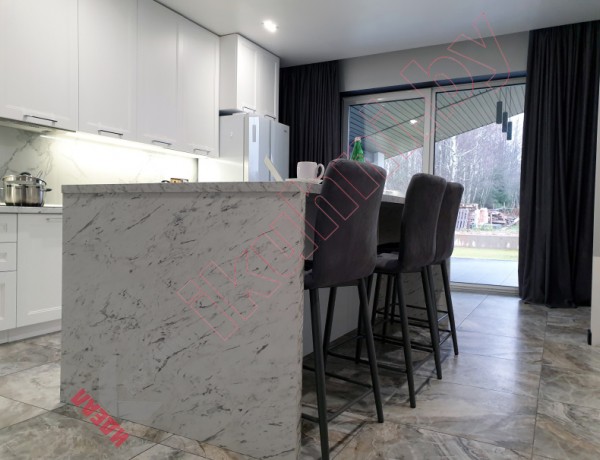 Кухня с фасадами двух цветов. Оснащена алюминиевой тонированной витриной.