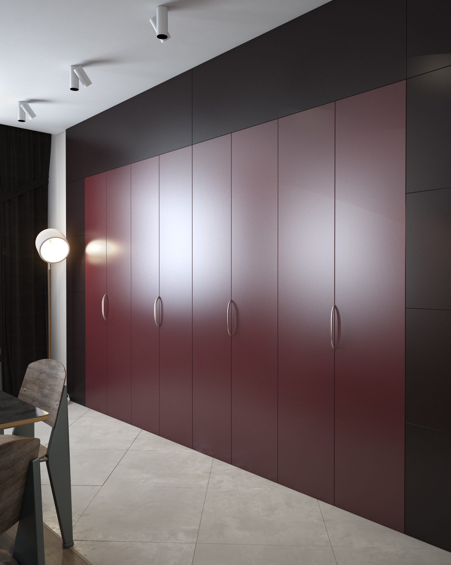 Эксклюзивная прямая кухня, маскирующаяся складными ставнями на ручках. Матовый темно-красный бордовый низ и ниша для встроенного холодильника слегка выступают вперед над уровнем кремового верха. Темная столешница выполнена под камень и подсвечивается. Фасады кухонного гарнитура изготовлены без ручек, а дверцы открываются за счет удобного зазора. Кухня легко прячется перегородками, тем самым превращая столовую зону в уютную гостиную.