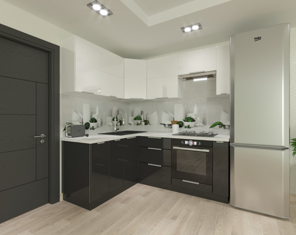 Двухметровая кухня с фасадами из ЛДСП двух цветов.