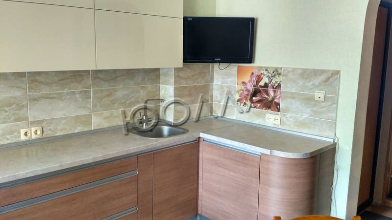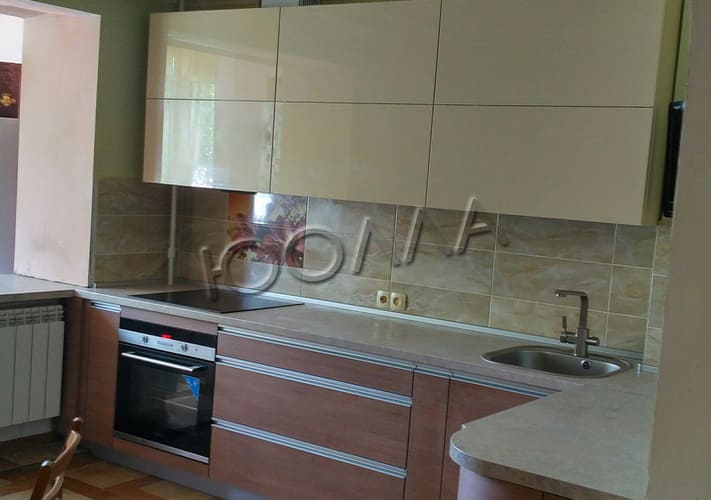 Угловой кухонный гарнитур в тонах дерева с навесным модулем в кремовом глянце. Столешница под камень, радиусный торец, фасады без внешних ручек. Кухня изготовлена со скрытыми креплениями и фурнитурой по немецкой технологии "Фолдинг".