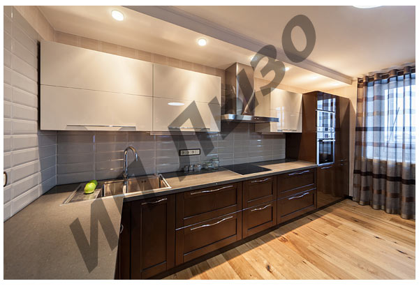 Кухня отличается привлекательным дизайном и высокой функциональностью. Нижние фасады окрашены в цвет орех, верхние – в белый глянец. Широкая рабочая зона обеспечит удобство при приготовлении пищи.