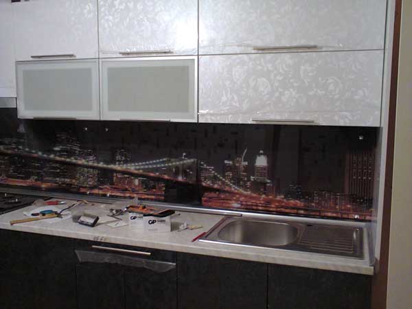 Скинали кухни выполнены с использованием фотопечати. На рисунке изображен пейзаж Нью-Йорка со стороны Бруклинского моста. «Большое яблоко» в свете ночных огней создает атмосферу модерна.