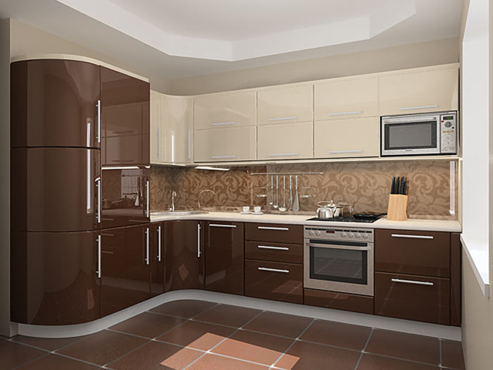 Угловая кухня выполнена в сочетании кофейного и сливочного цвета. Широкие прямоугольные ручки выполнены из хрома. Для комфорта в работе гарнитур оснащен подсветкой. Большое количество выдвижных и распашных ящиков позволит расположить все необходимые кухонные принадлежности.