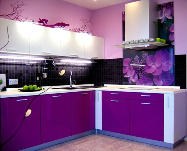 Угловая кухня выполнена в сочетании ярких цветов. Верхние фасады окрашены в белый цвет, нижние – в сиреневый. Гарнитур оснащен подсветкой, которая обеспечит комфортную работу в темное время суток.