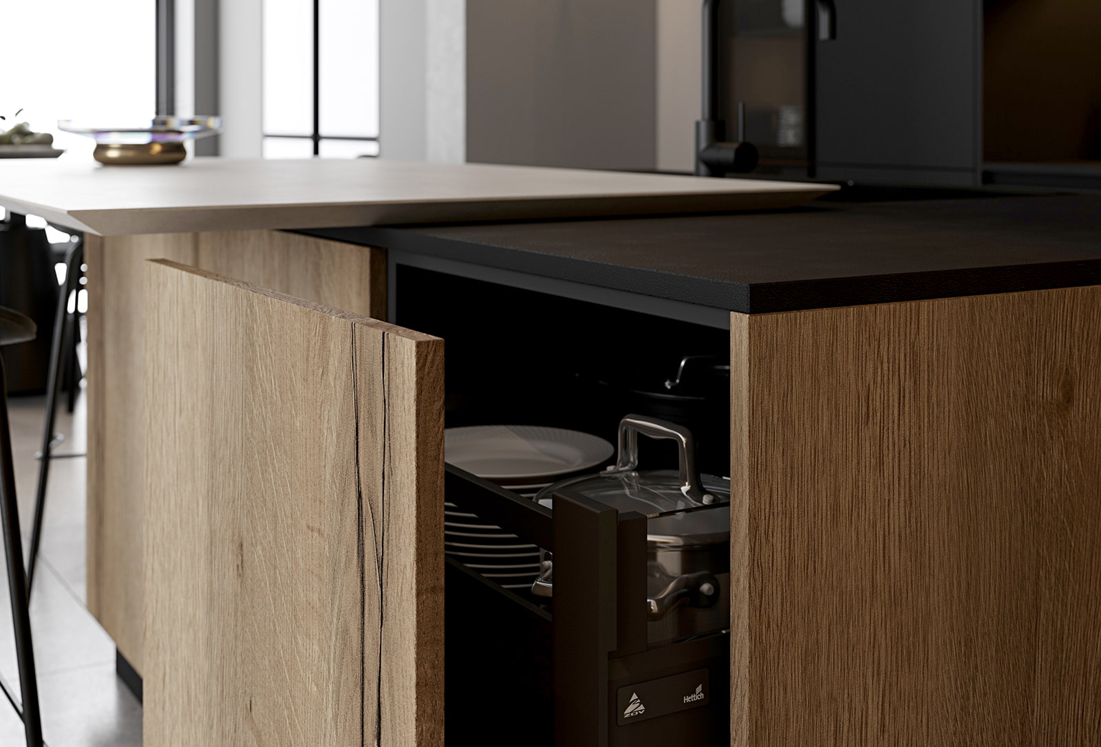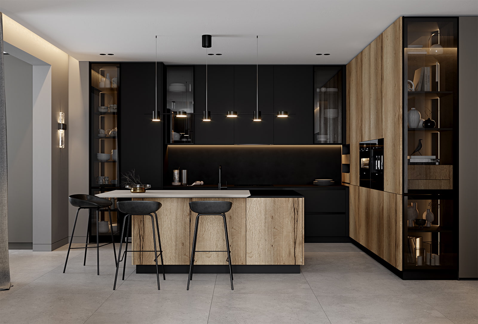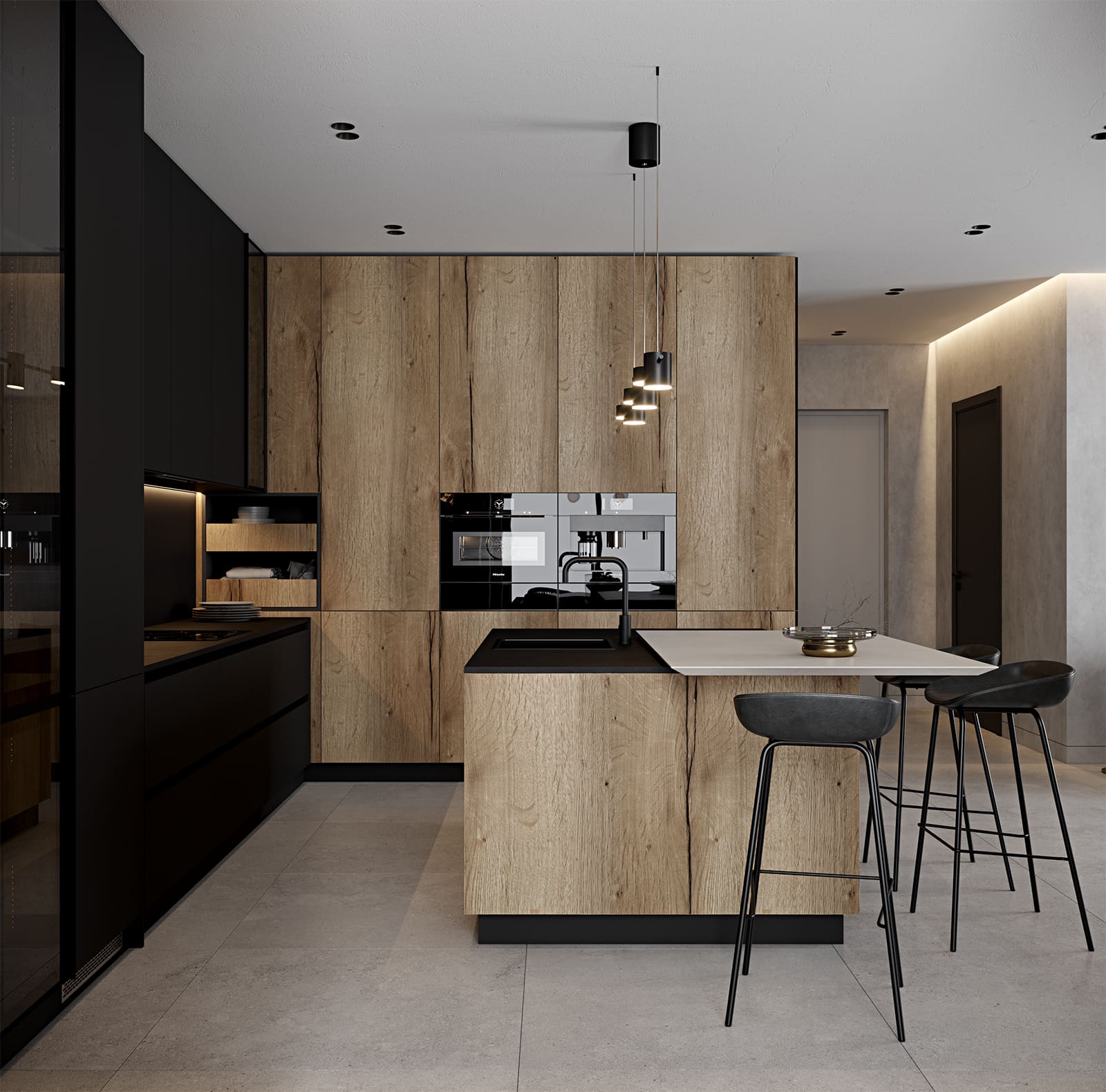 Фасады лмдф, цвет черный супрамат / лдсп тимбер, декор галифакс столешница hpl, 20 мм, цвет вулкано / керамогранит, 28 мм, декор вилма (угол скоса 60˚)