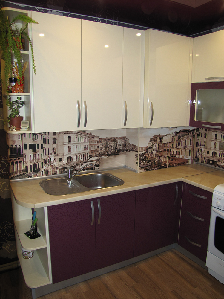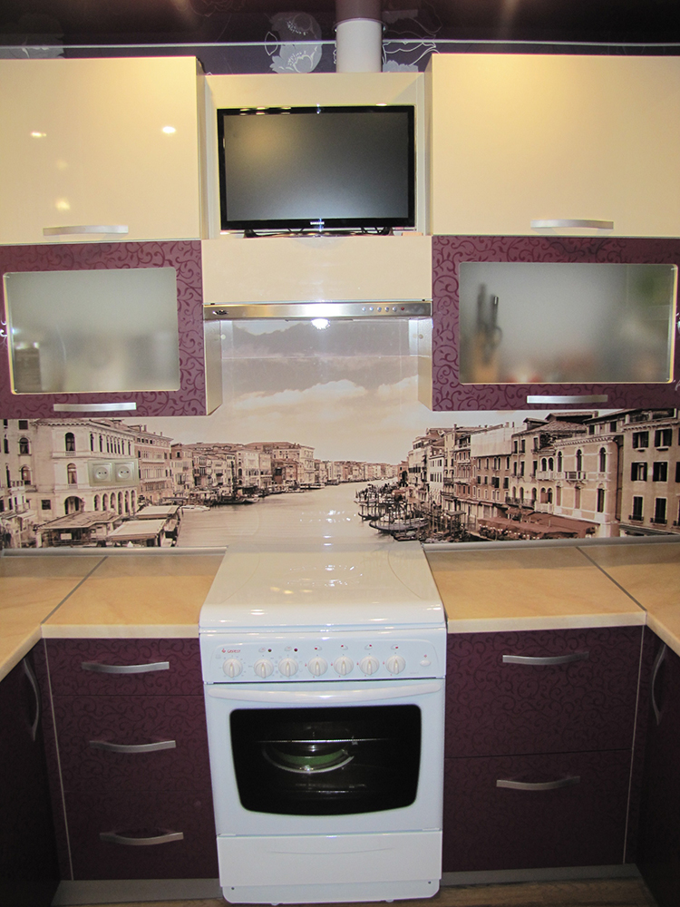 Кухня «Эконом» выполнена в сочетании двух цветов. Фасады напольных тумб украшены цветом сливы с пестрым рисунком. Фасады подвесных шкафчиков – в нежном оттенке ванили. Компактная конструкция очень функциональна и не занимает много места.