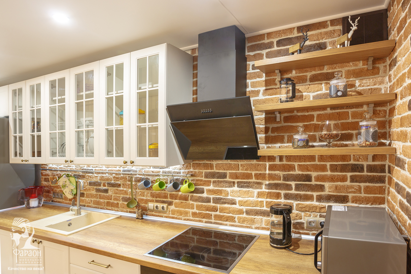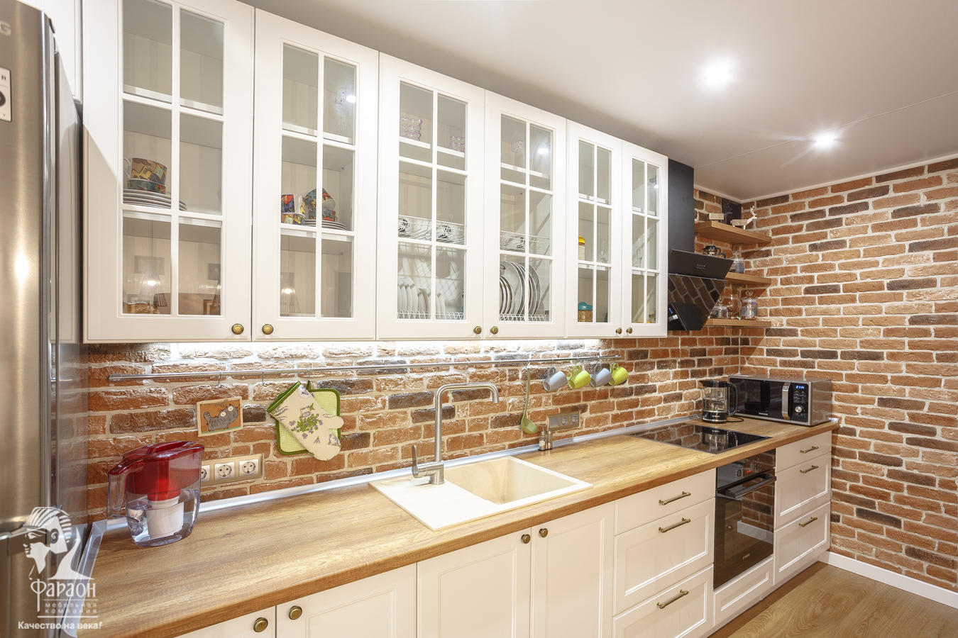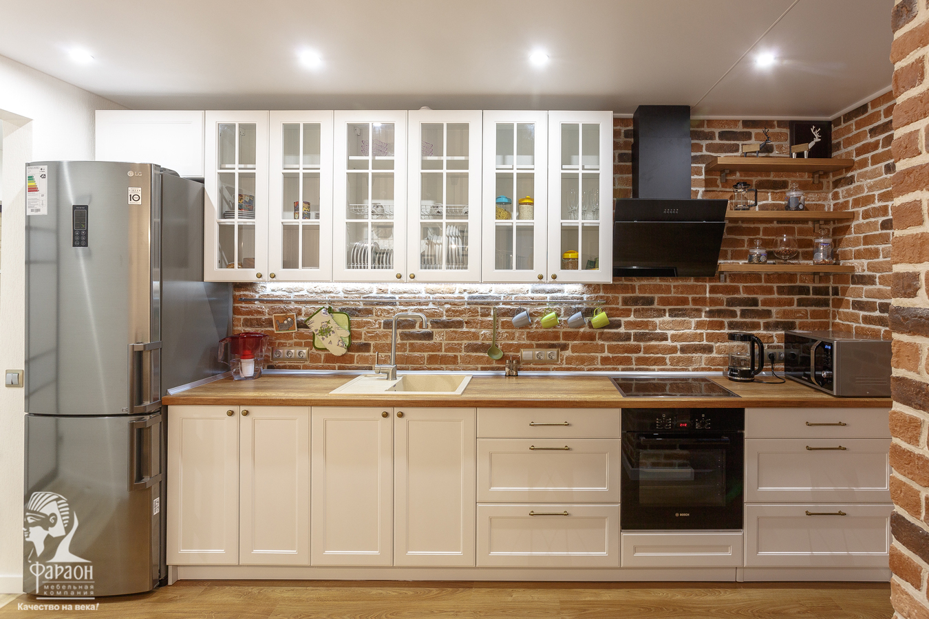 Темные и светлые фасады из пленочной МДФ. Ширина кухни 210 см.