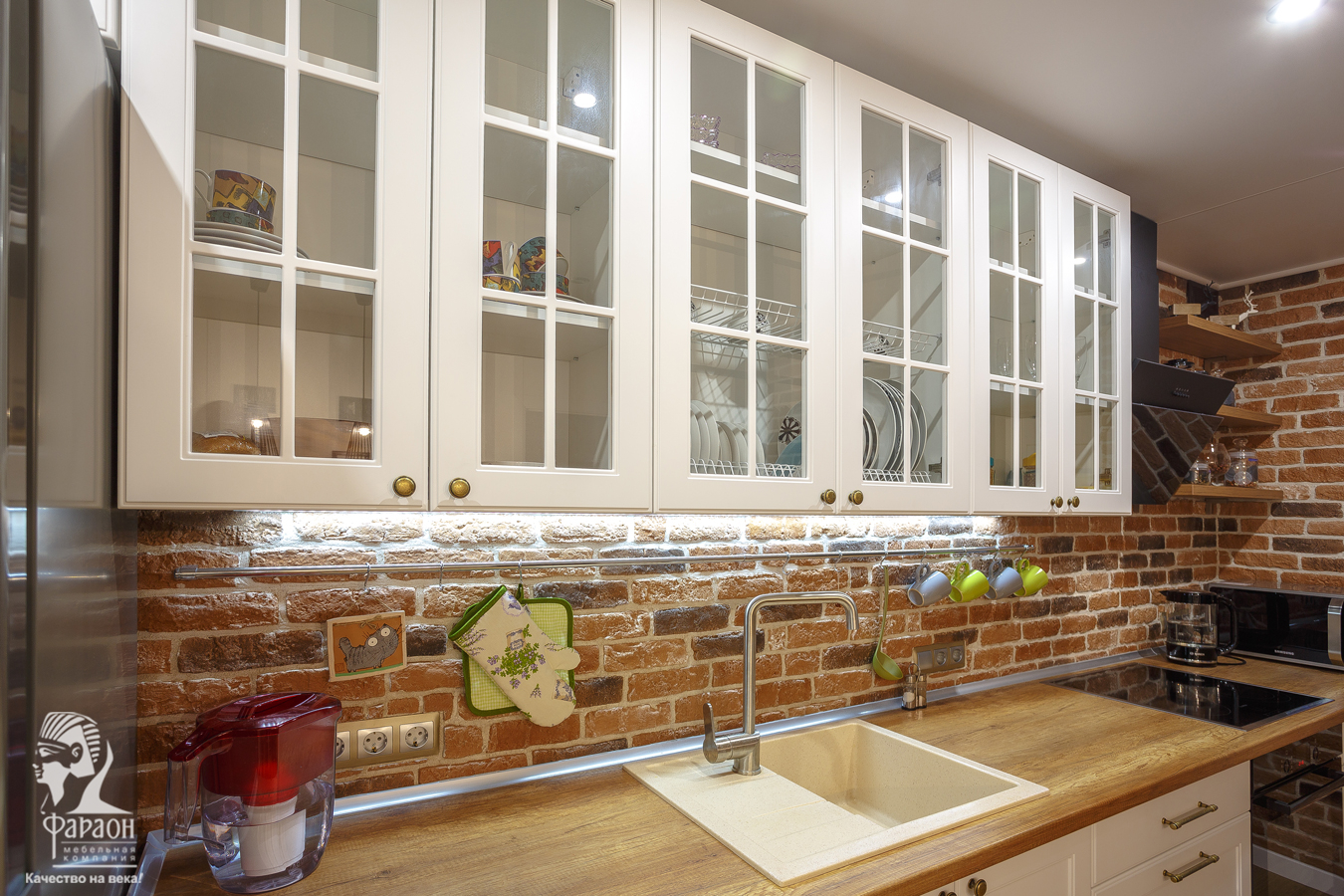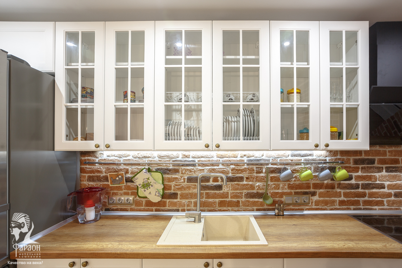 Угловая кухня 150х140 см со вставками стекла в навесных шкафах.