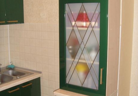 Дополнительно: Корпус - ДСП ламинированное «Kronopol» (Польша) – цвет клён натуральный. Фасады – МДФ крашеный – краска «Saerlak» (Германия). Постформинг – «Getalit» (Германия). Стекло – витражи с металлической жилкой