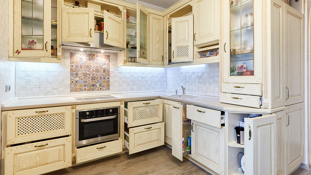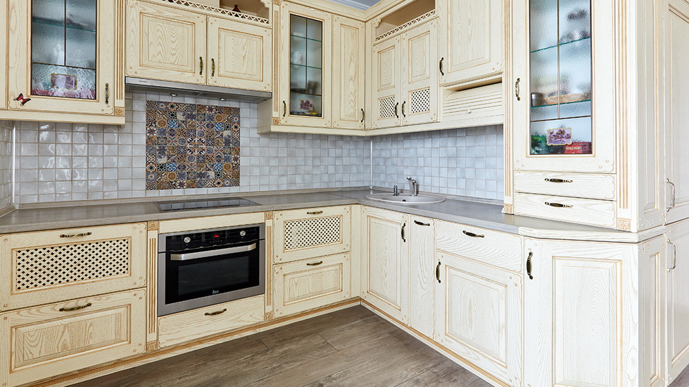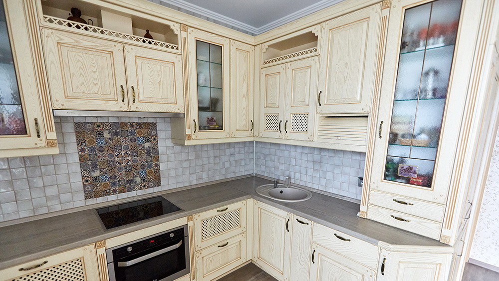 Широкая угловая кухня из ДСП. Навесные шкафы украшены вставками из матового стекла.