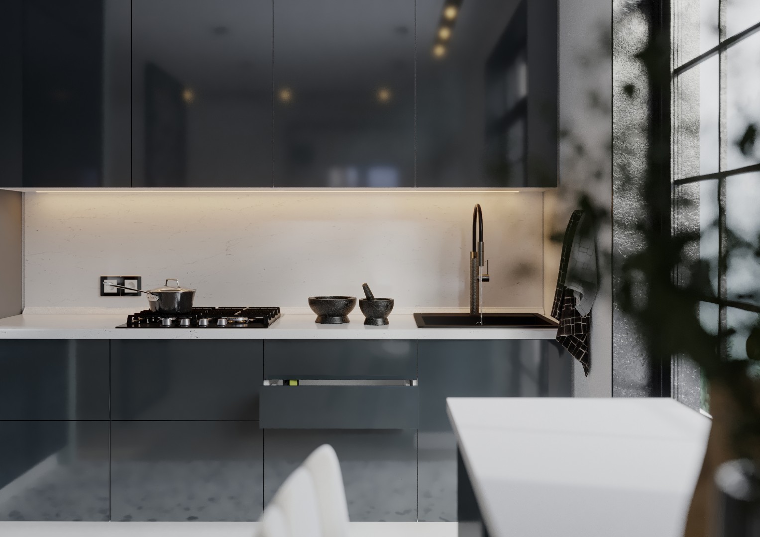 Материал фасада и корпуса: ЛДСП 16 мм. Ширина кухни 110 см.