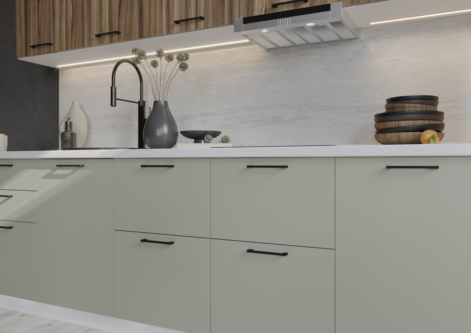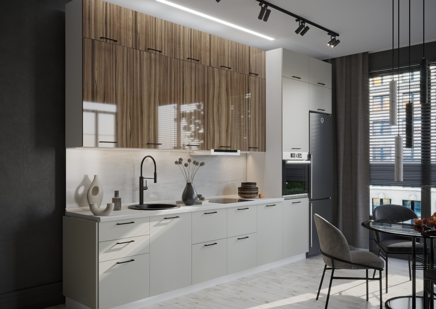Универсальный светло-серый цвет фасадов в тандеме с древесным оттенком столешницы.