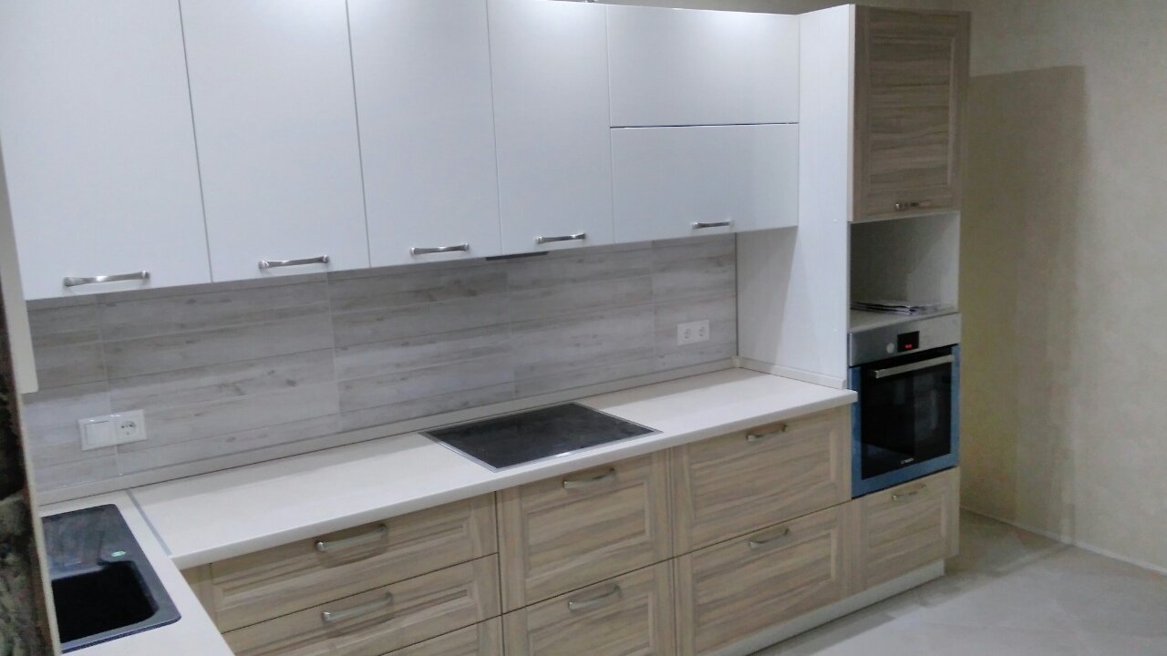 Скинали с фотопечатью, глянцевые фасады, хромированные ручки.