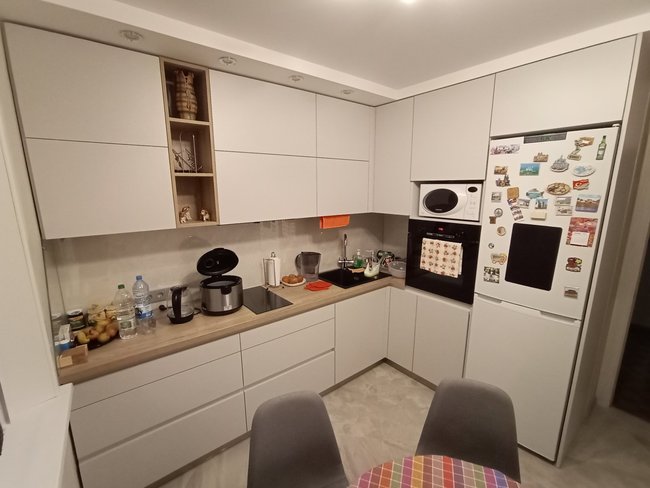Кухня длиной 140 см. Фасады из ДСП двух цветов.
