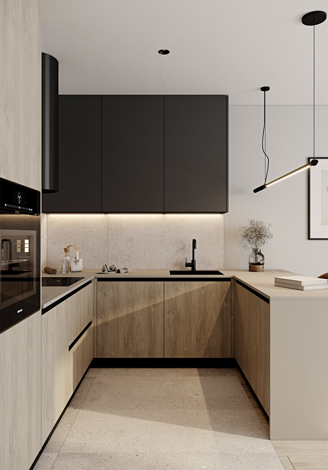 Синий оттенок фасадов удачно сочетается с древесной вставкой.