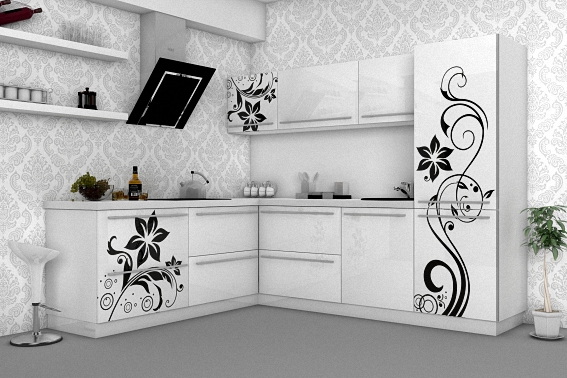 Компактная угловая кухня с контрастной столешницей белого цвета в тон фасадов. Широкие металлические ручки расположены горизонтально. Фурнитура европейского производства.