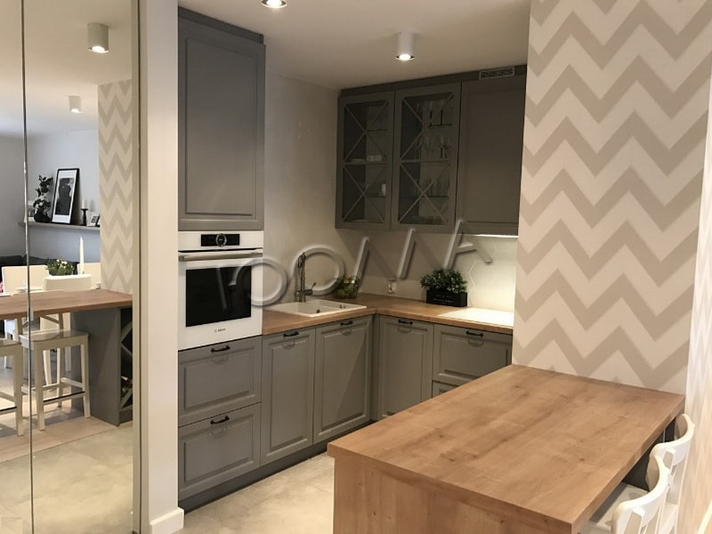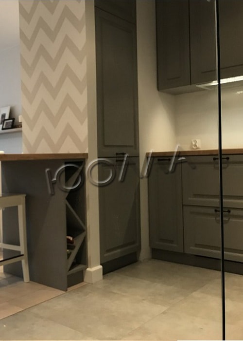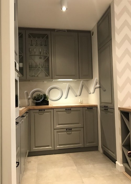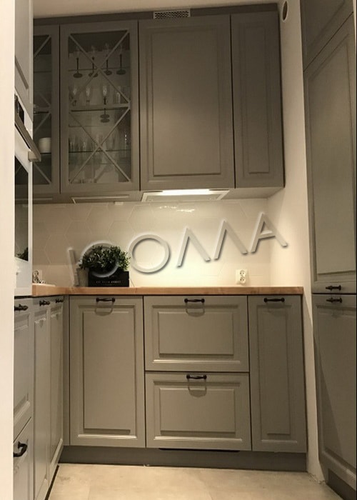 код 89657Стильная кухня темно-серого цвета в классическом стиле легко впишется в любой интерьер. Столешница под дерево.