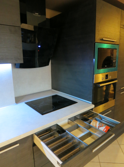 Темная матовая кухня с подсветкой белой столешницы и нишами для встроенной техники. Максимальная функциональность за счет качественной фурнитуры «Блюм» австрийского производителя.