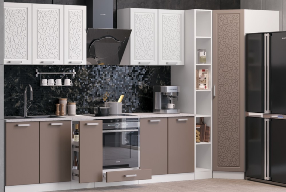 Готовый гарнитур с комбинированными фасадами из ЛДСП. Ширина кухни 140 см.