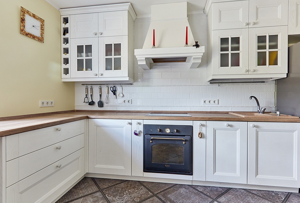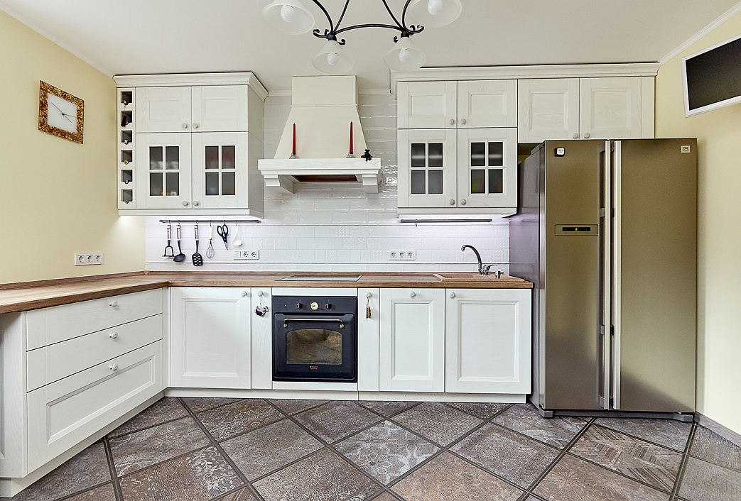 Угловая кухня с белыми фрезерованными фасадами