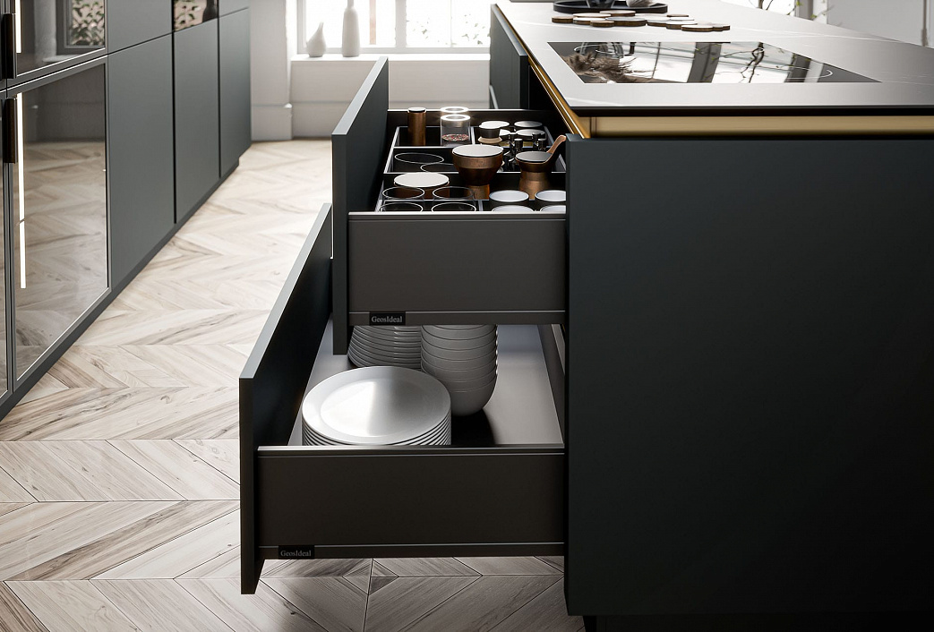 Практичные материалы. Выдвижные ящики на шариковых направляющих.