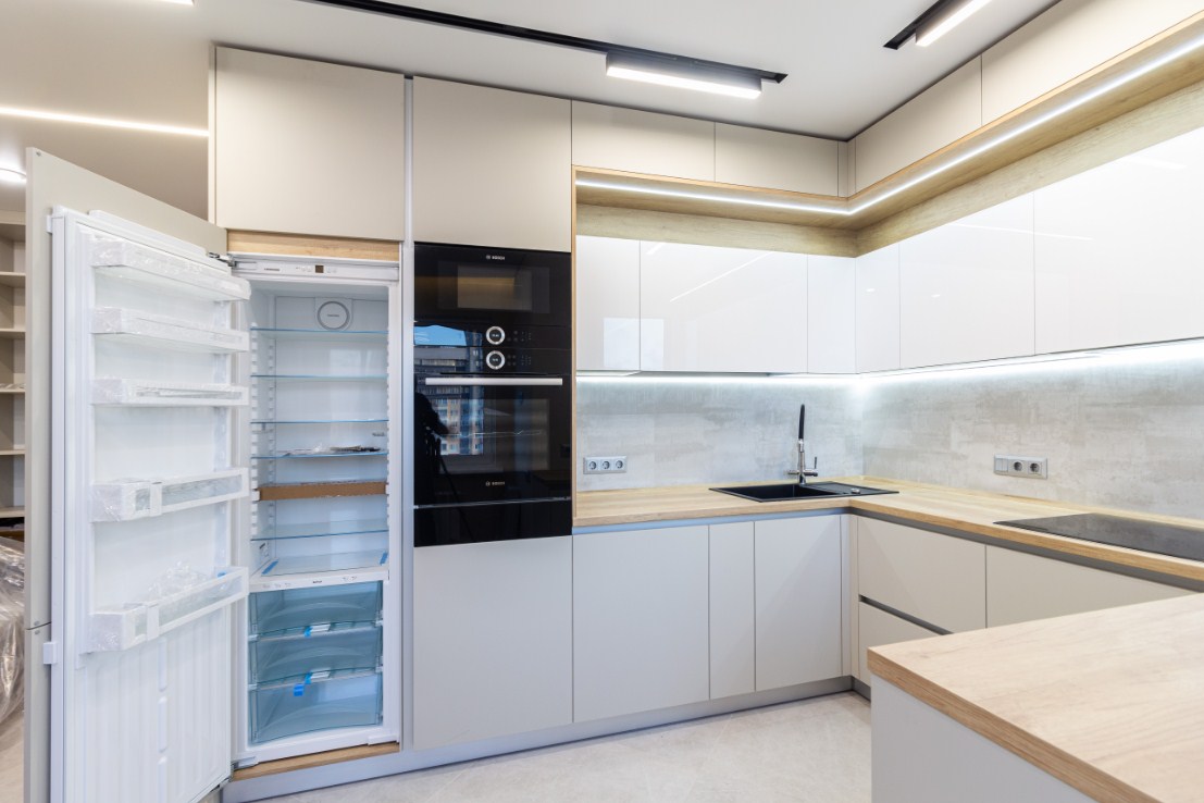 В цену входит: изготовление, доставка, установка, врезка вклейка мойки, варочной панели, монтаж всей бытовой техники, подключение вытяжки к вентканалу, монтаж и подключение подсветки. Стоимость бытовой техники в цену кухни не входит.