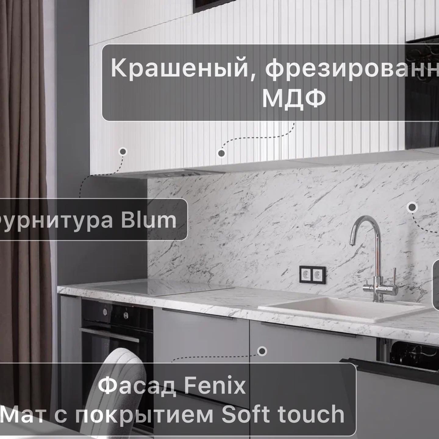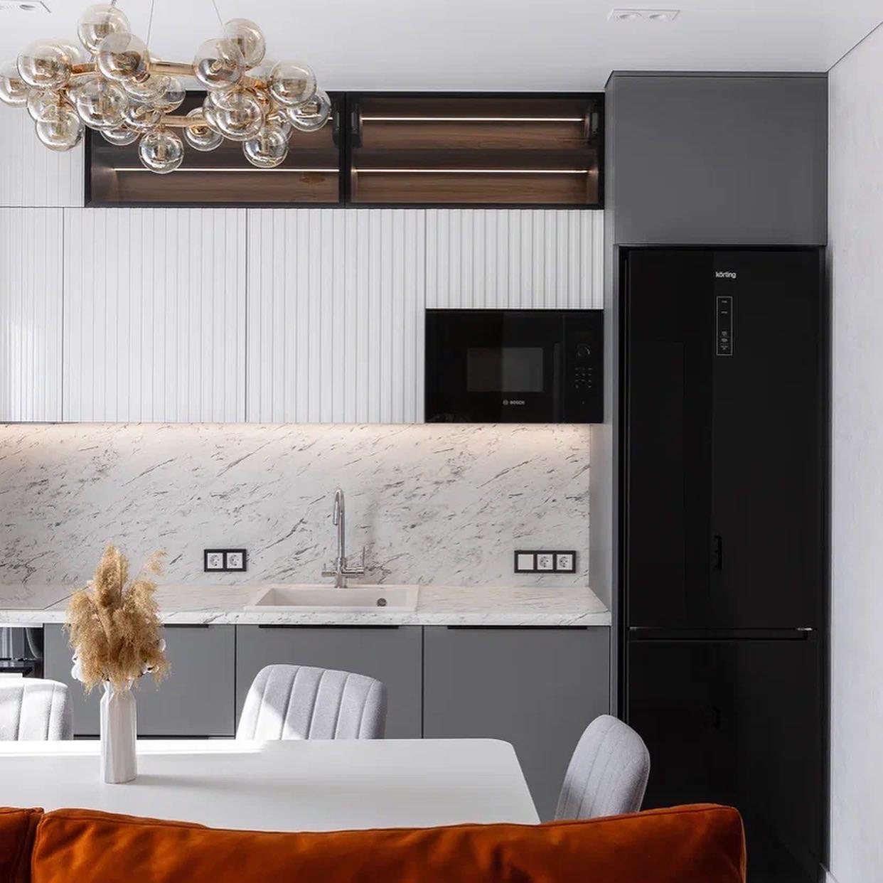Современная кухня в благородной цветовой гамме с акцентом на вертикальную фрезеровку и мраморную текстуру. Идеально подойдёт для интерьеров в стиле минимализм, неоклассика или soft-modern.