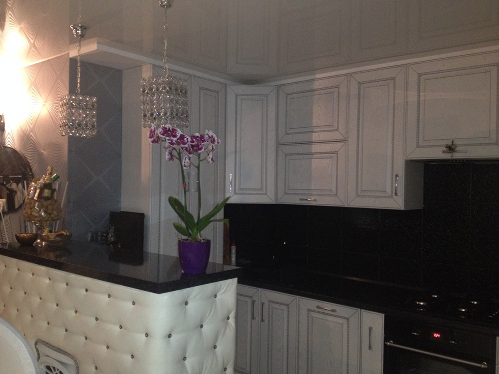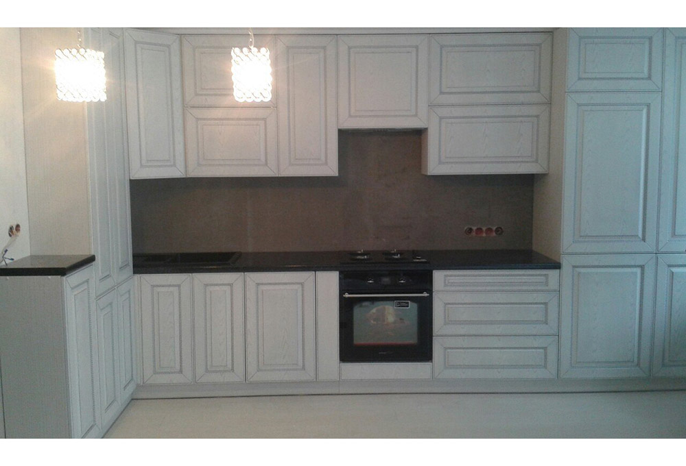Гарнитур исполнен в контрастном цветовом исполнении. Белый корпус и фасад аккуратно оттенены черной столешницей и фартуком. Кухня выполняется под заказ, а потому идеально соответствует пожеланиям клиента.