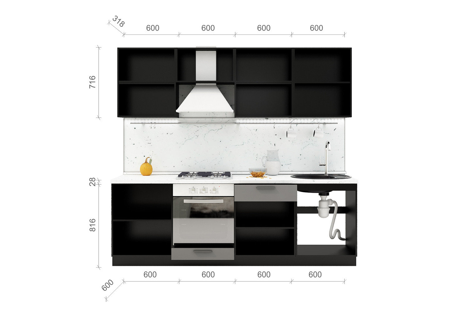Общая ширина кухни: 2400 мм